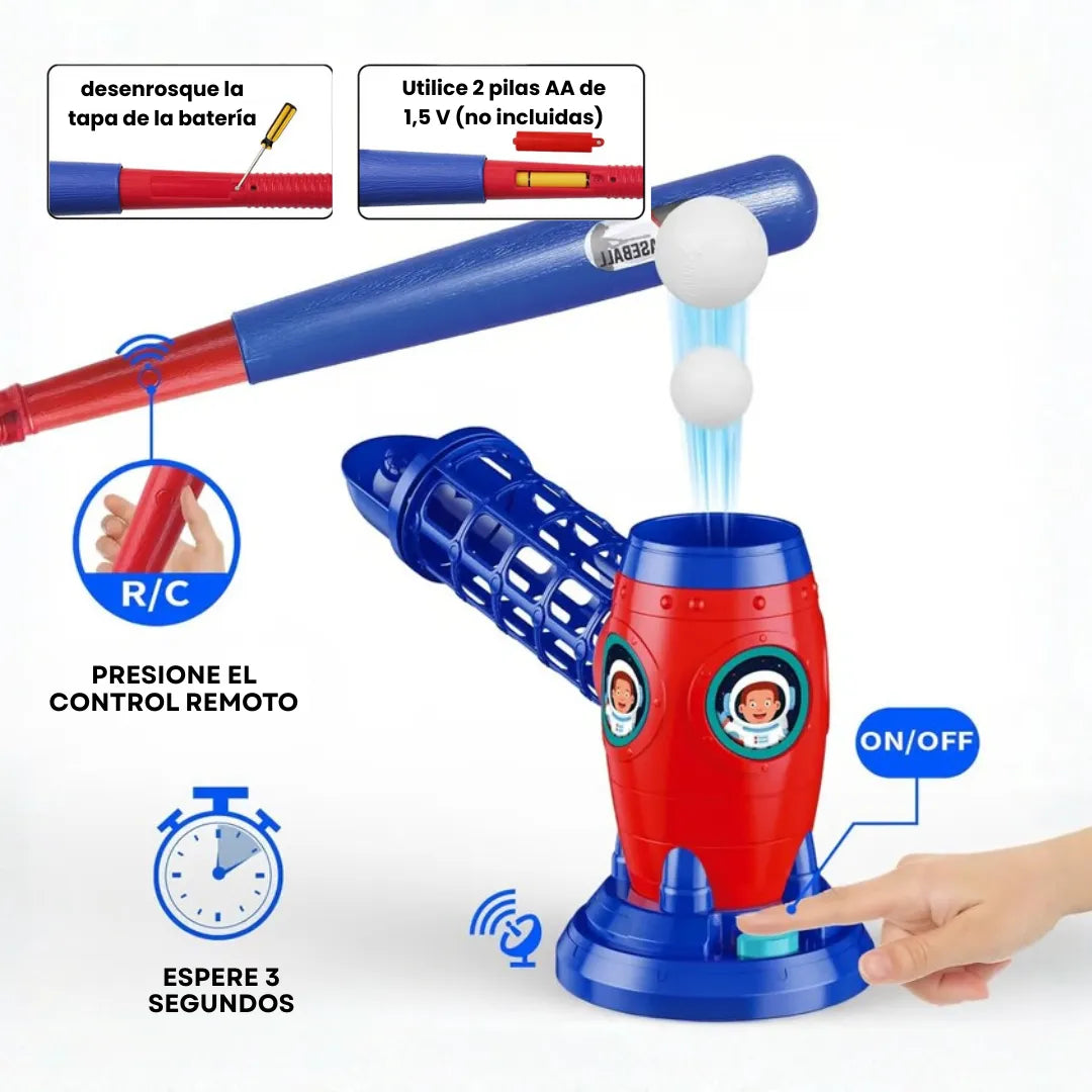 Componentes: 1 base de lanzamiento, 1 bate de plástico reforzado, 3 pelotas.