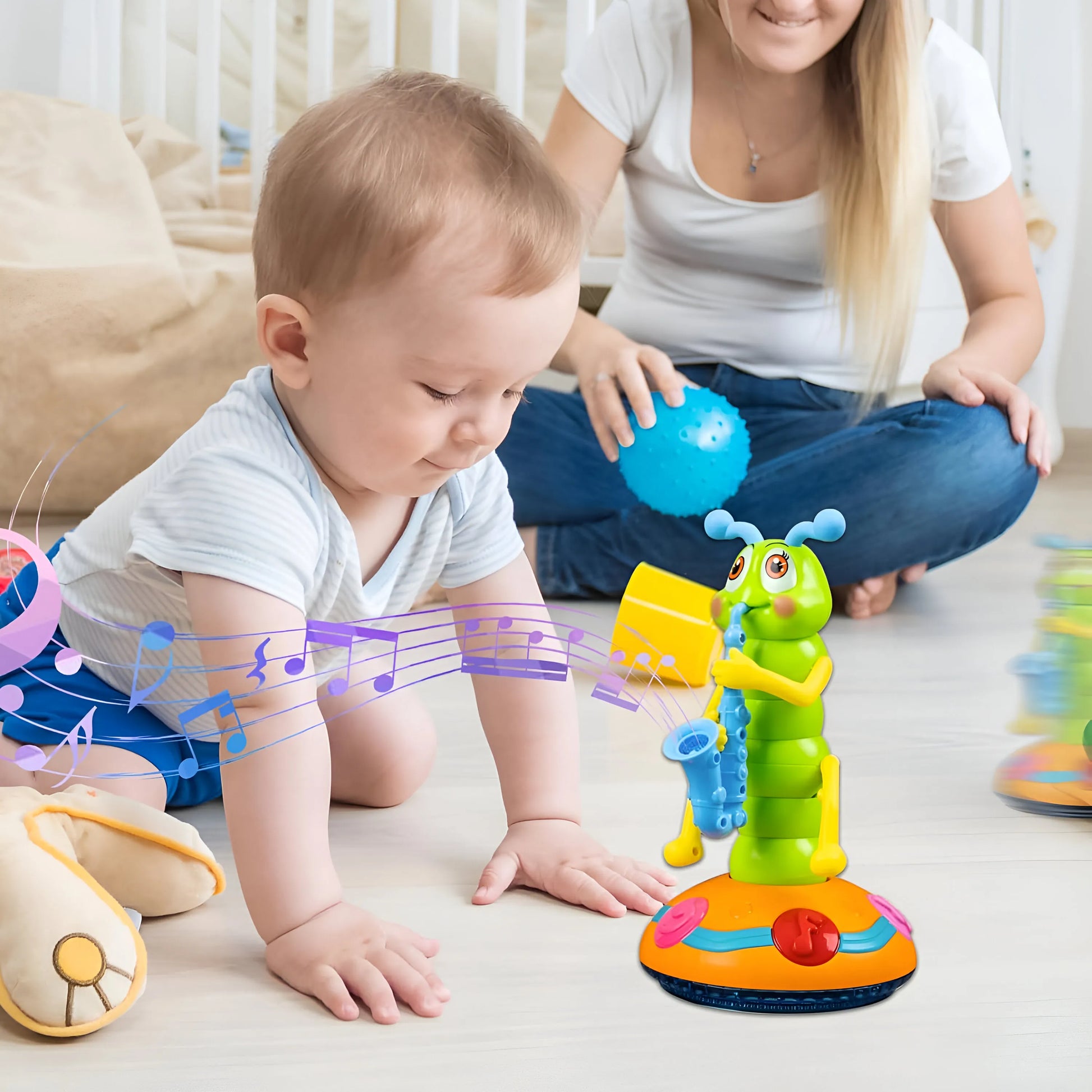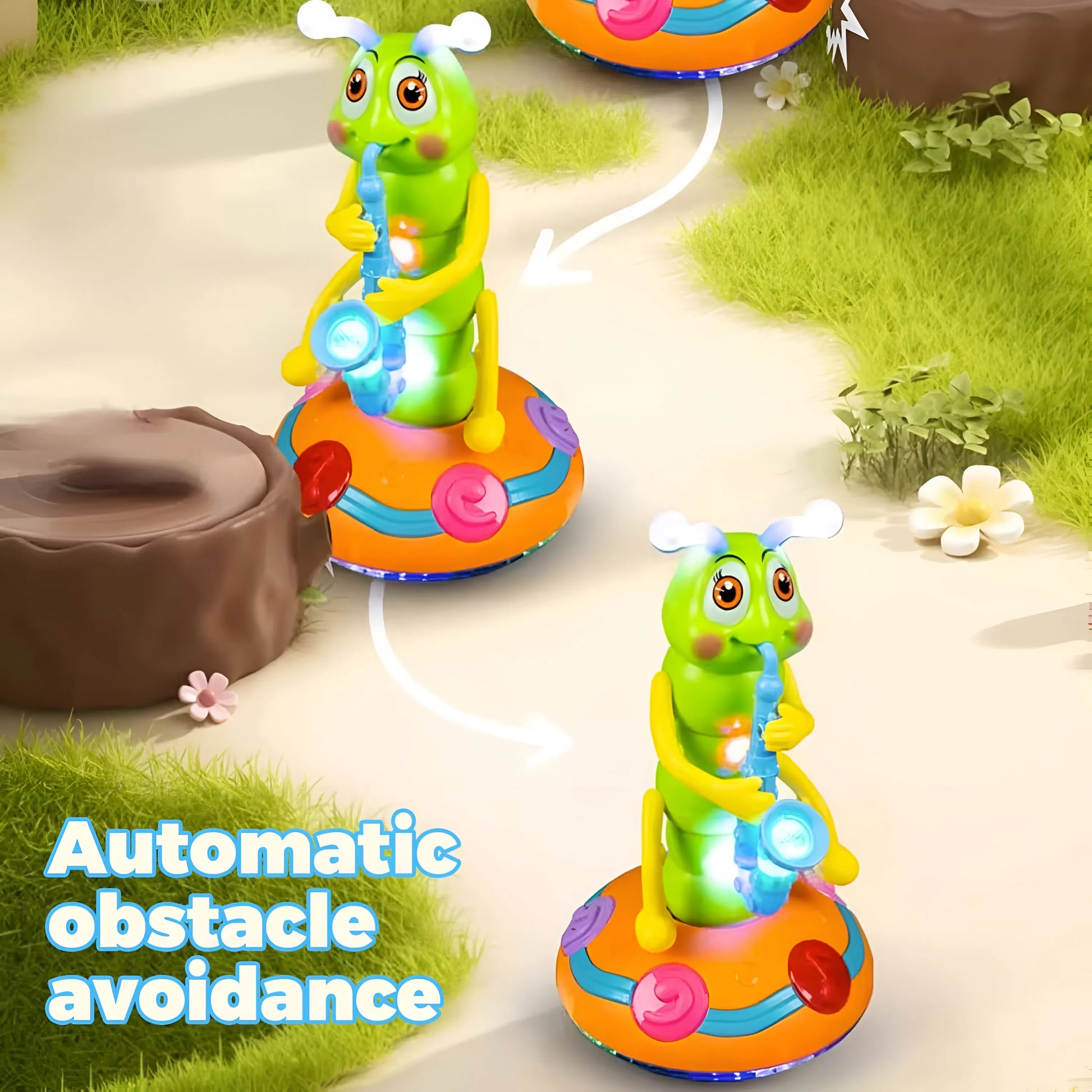 La oruga se mueve de manera cautivadora mientras toca el saxofón, fomentando la coordinación y el ritmo.